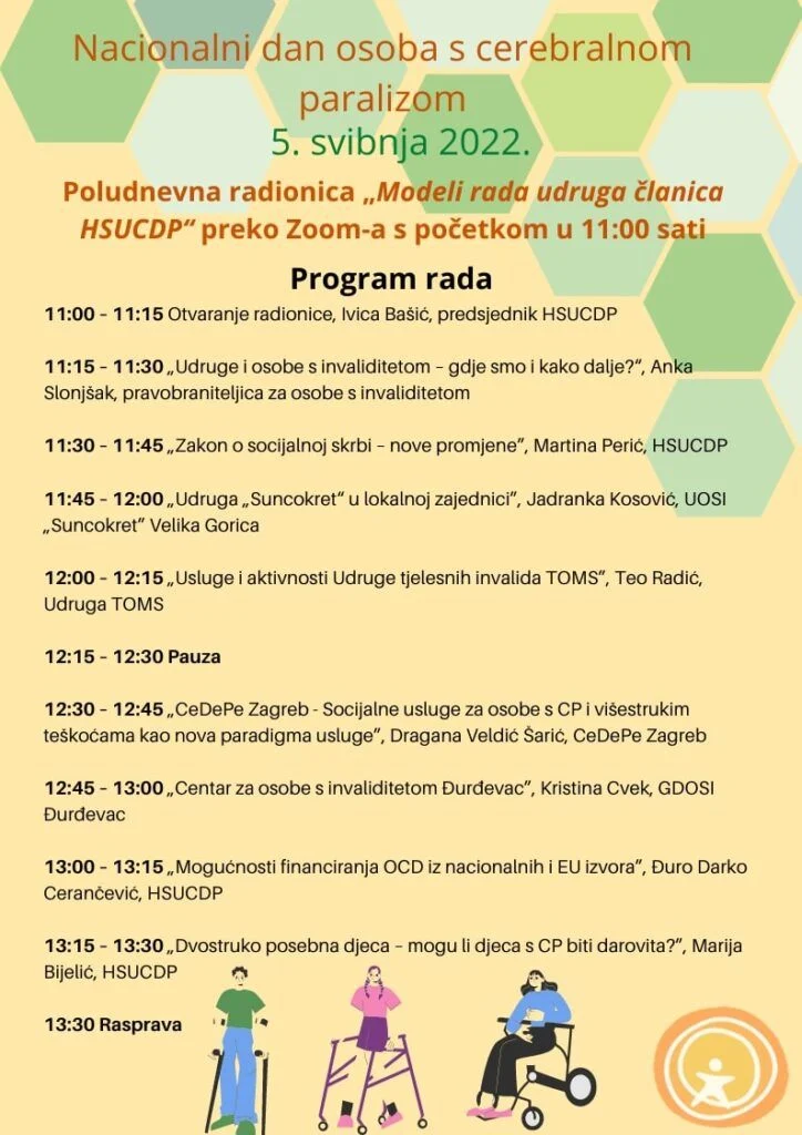 Hrvatski savez udruga cerebralne i dječje paralize (HSUCDP) danas, 5. svibnja obilježava Nacionalni dan osoba s cerebralnom paralizom organizacijom online radionice pod nazivom „Modeli rada udruga članica HSUCDP“.
