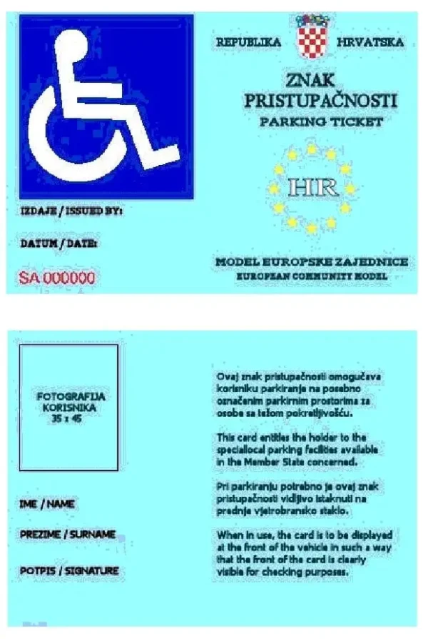 Znak pristupačnosti je kartica pravokutnog oblika, veličine 106 x 148 mm koja omogućuje korisniku besplatno parkiranje na posebno označenim parkirnim prostorima za osobe s težom pokretljivošću. Znak pristupačnosti glasi na osobu – ima fotografiju korisnika te njegovo ime, prezime i potpis. Pri parkiranju je potrebno znak pristupačnosti vidljivo istaknuti na prednje vjetrobransko staklo. PARKIRNO MJESTO: Mjesto rezervirano za parkiranje vozila osoba s invaliditetom mora imati na kolniku ucrtane rubne crte i simbol koji označava parkirno mjesto rezervirano za osobe s invaliditetom žute boje. Mjesto mora biti obilježeno i znakom „parkirališta“ s dopunskom pločom koja označava parkirno mjesto rezervirano za osobe s invaliditetom.