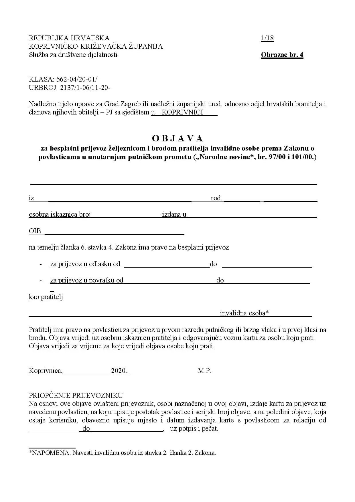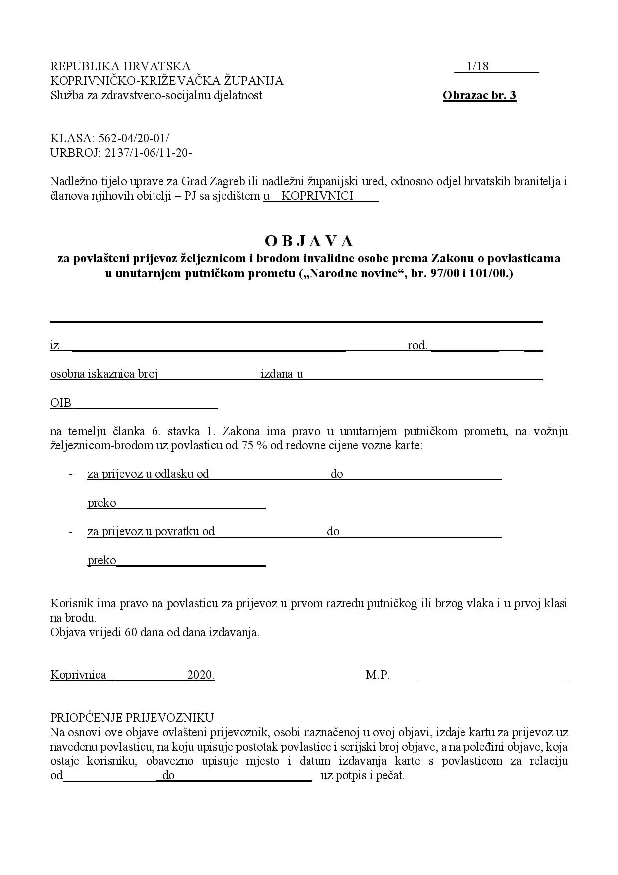 Na temelju OBJAVE ZA POVLAŠTENI PRIJEVOZ (Obrazac br. 3) i OBJAVE ZA BESPLATNI PRIJEVOZ (Obrazac br. 4) koju izdaje Koprivničko-križevačka županija.