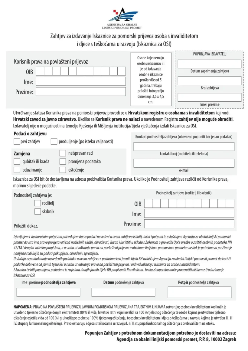 Dokumentaciju za izdavanje Iskaznice za osobe s invaliditetom potrebno je dostaviti na adresu: Agencija za obalni linijski pomorski promet, PP 8, 10 002 Zagreb