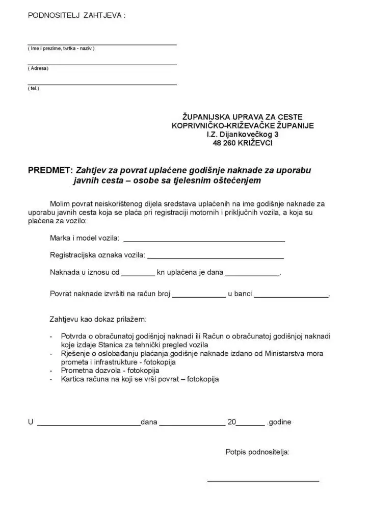 Potrebno je podnijeti Zahtjev za povrat uplaćene godišnje naknade za uporabu javnih cesta nadležnoj Županijskoj upravi za ceste i potpisati Privolu za suglasnost obrade osobnih podataka.